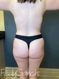 Shown before and 3 months after undergoing bilateral breast reduction and lift on the left side along with 3.6 liter liposuction contouring of the abdomen, flanks and lateral chest. She now enjoys more symmetric breasts and an hourglass shape she always desired. No fat was added to the buttocks although it appears more shapely after liposuction of the waist!